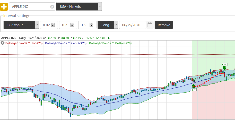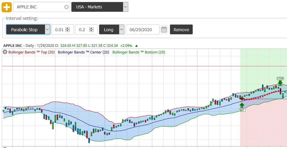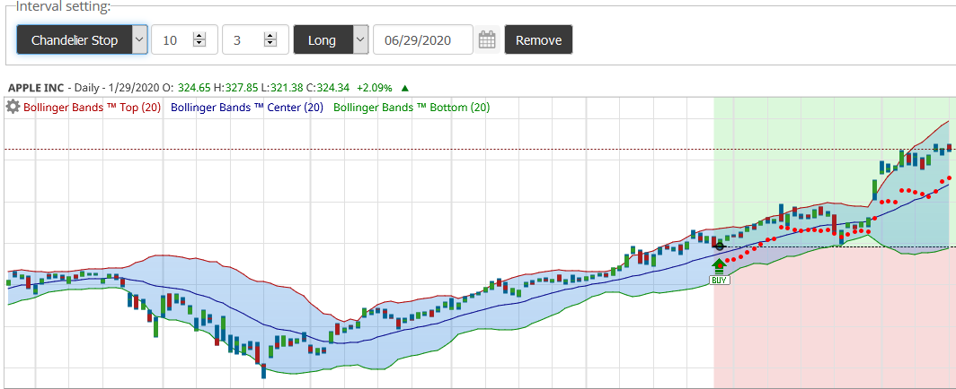 Plotting Chandelier, BBStops™, and Parabolic stops on the price chart is a feature available to BollingerBands.us subscribers. The stops and systems can be plotted for long and short positions. As data is updated your stops are updated automatically.